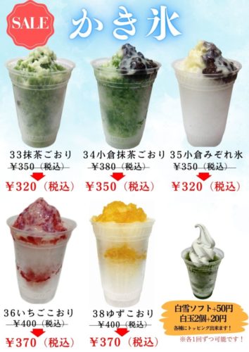 かき氷30円引き。日本茶各種20%オフです!