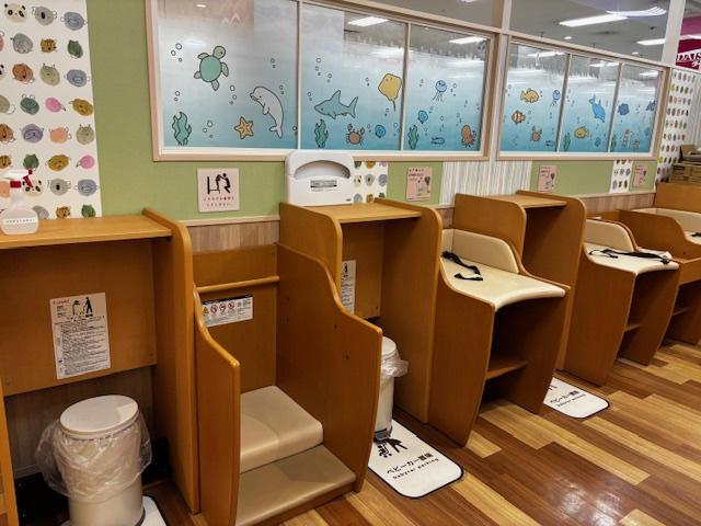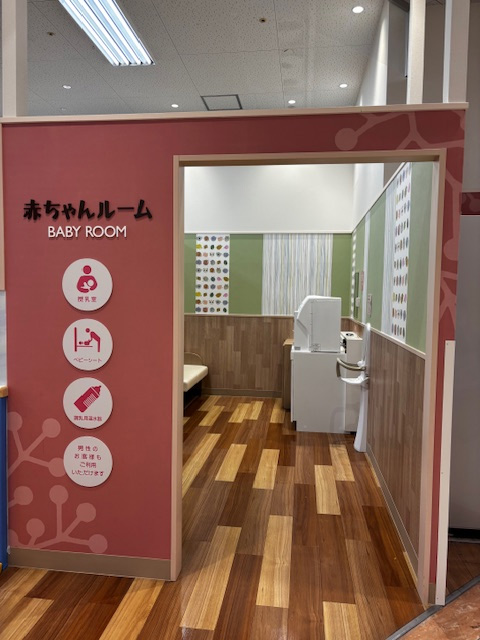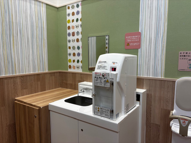 おむつ交換台、立ったままでパンツ型のおむつ替えが可能なおむつ替え台、調乳機、授乳室完備。